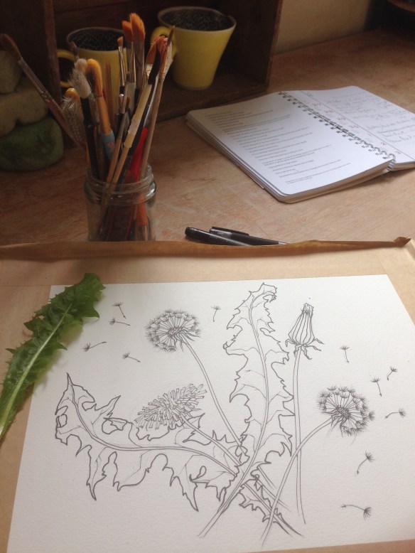 I recently photographed a new selection of dandelion specimens just to remind my drawing brain what they really look like after a winter of illustrating from memory. I only throw and illustrate porcelain now – a very different look from my earthy terracotta pieces. The dandelion lends itself just as well though and, despite the hand cramps, I never tire of drawing it…