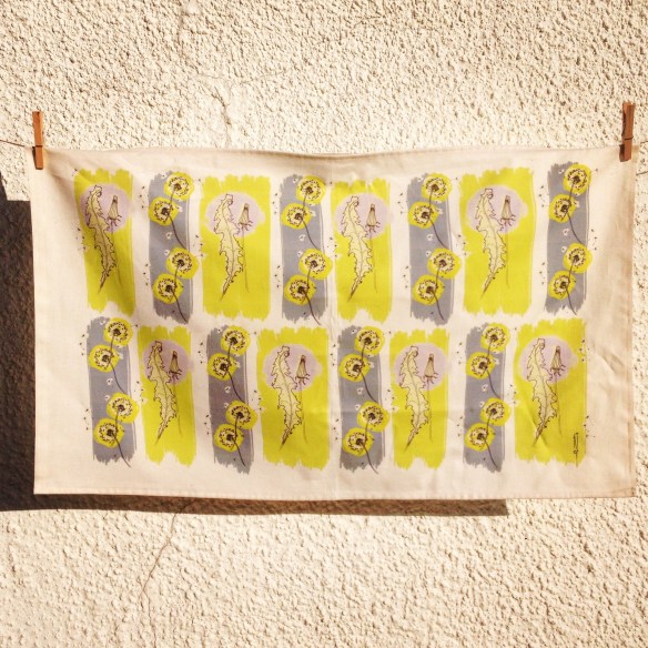 Above you can see slip and sgraffito decorated earthenware mugs in dandelion thistle – I no longer make them but a client commissioned them to add to their collection of this work. My first dandelion tea towel is shown below with a 50s colours and feel. I’ve updated the design for 2018 in fresh slate and citrine on white, increasing the scratchy mid century modern look. It’s pictured at the top of this post.