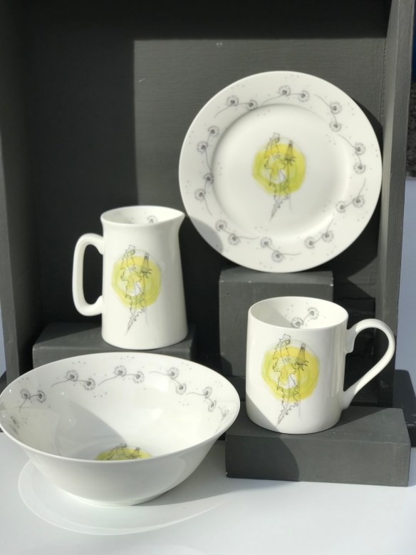 I also produce fine bone china wares – firing my illustrations on to ready made pieces instead of creating each vessel from scratch. It’s a different feel and I like the utilitarian uniformity and perfection it gives the pieces. It also means I can produce matching tea towels – a source of great satisfaction to me. Some artists relish the giclee print and the framed work but I love the idea of my designs finding their way into my favourite room in the house, the nurturing kitchen at its heart.