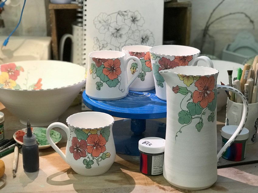 Illustrated nasturtium porcelain before final glaze firing. Published June 19, 2021 at 4032 × 3024 in Illustrated nasturtium porcelain before final glaze firing.