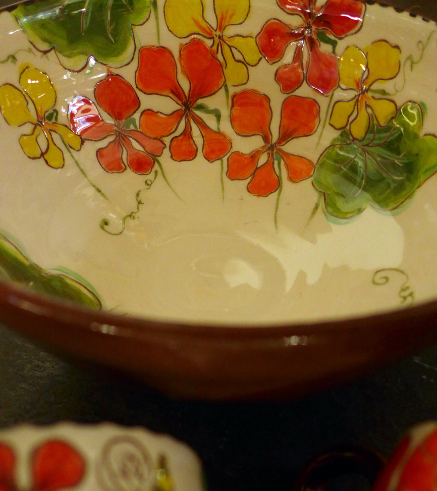 And from the archives here are a couple of shots of my first ever nasturtium designs, produced using the traditional technique of slip decoration with sgraffito (scratching into the clay) to describe the outlines.