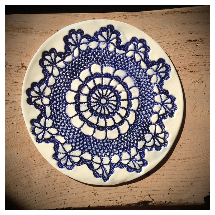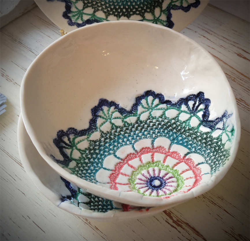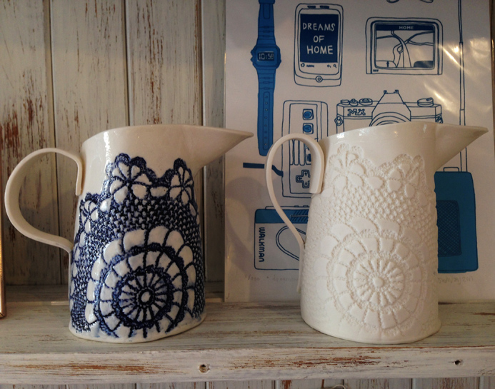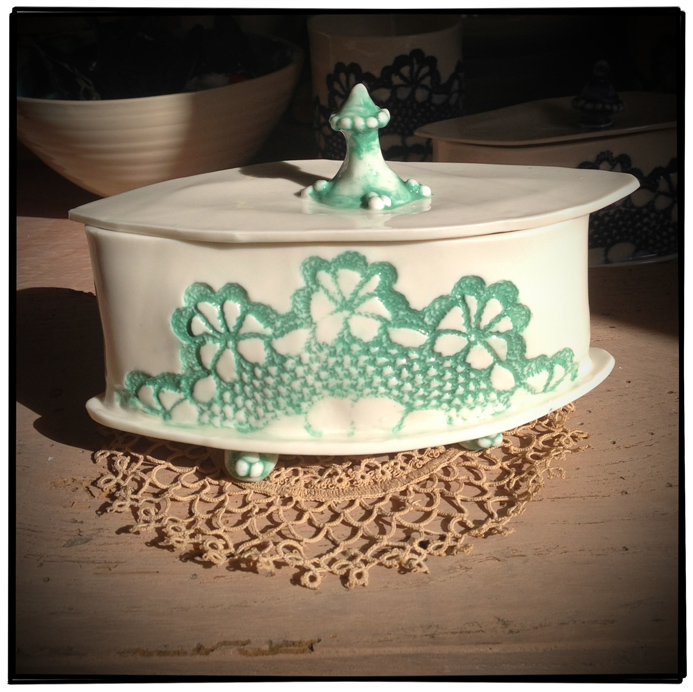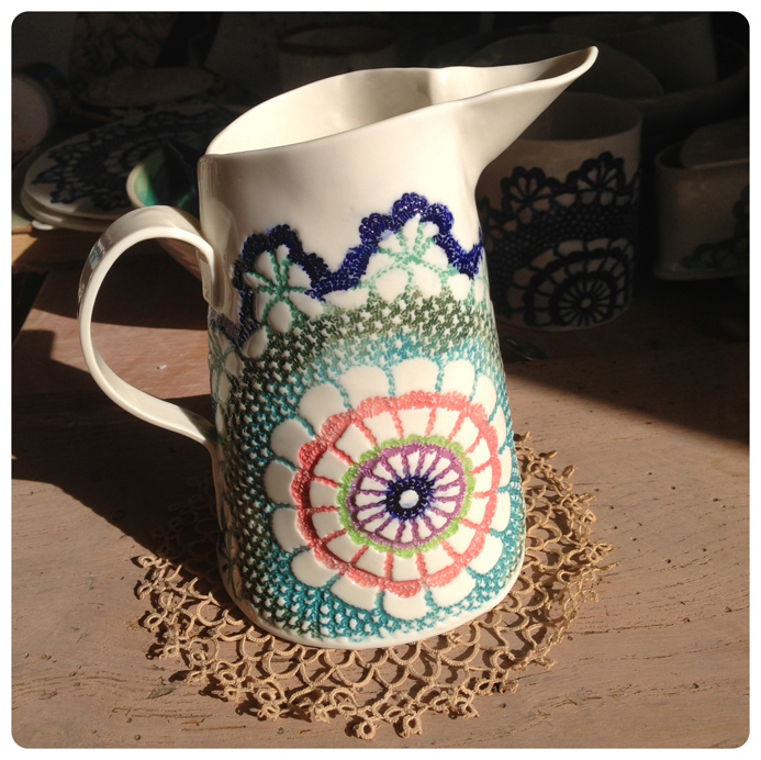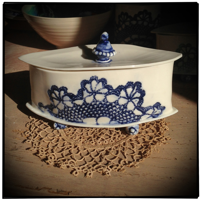 I’m really getting a positive response from people on my handbuilt porcelain ware. I use ‘slab-building’ for this (although you could hardly call the sheets of porcelain that I roll out as ‘slabs!’) and press moulding for the bowls. The techniques, with really thin fine porcelain produce slightly warped pieces – all uniquely shaped but with a strong design which ties them together. The imprinted design, using a vintage lace doily which is first bisque-fired, is hand painted using a variety of oxides and underglazes before firing again with a transparent glaze to create a really vibrant colourful piece… The range is expanding; it’s gone from jugs through teapot stands all the way to limited edition jewel caskets!